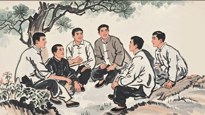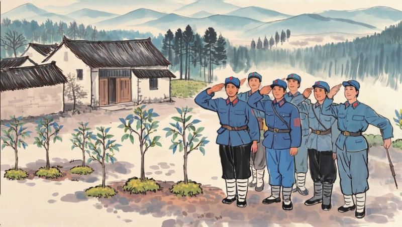 8.六位青年眼看就要离开家乡了,他们又自发地聚在一起讨论着:“我们每个人种一棵树吧。亲人们看到这些树,就会感觉我们一直陪伴着他们。”“种桂花树,给家乡、给亲人留下一个团圆的念想。”“革命一定会胜利!等将来革命胜利了,我们在桂花树下团聚”……